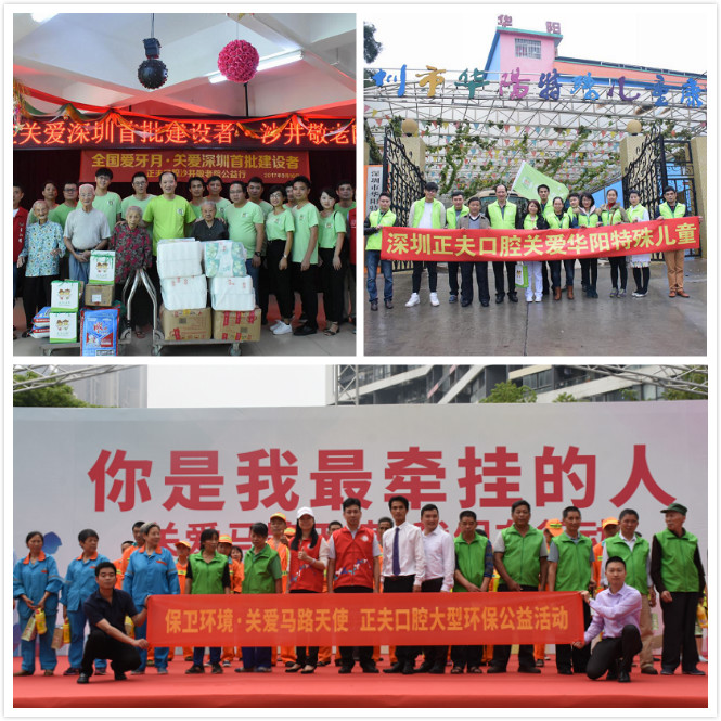 在过去几年,在爱心活动和公益事业上,正夫口腔是不遗余力的。我们曾带领公司员工到沙井敬老院为老人家献爱心、送礼物;也曾探访过深圳华阳特殊儿童,为他们做口腔检查;还曾组织过“关爱马路天使,我们在行动”大型公益活动,等等。