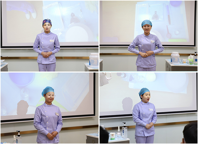 在操作技能比赛环节,包含四大项目:①患者就诊前,环境及医护人员自身评估;②操作前,所用无菌物品的三查七对;③娴熟的调拌技术;④操作后,诊间物表、诊间空气,可循环使用器械的处理方法。贴近临床实际,全面考核了护理人员的理论知识、业务能力和职业精神。正夫口腔护士们整洁的仪表,娴熟规范的操作技能和充满人文关怀的温馨话语,技惊四座!