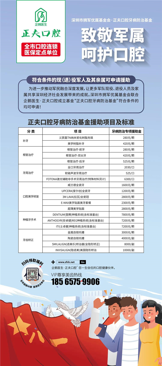 拥有一口美丽健康的牙齿已成为当代人全身健康的重要标志之一,口腔健康更是保障人们生活质量的重要方面。为了让更多的现(退)役军人及其家属能够切身感受到口腔医疗带来的福祉,在此之前企鹅医生·正夫口腔还成立了“深圳市拥军优属基金会·正夫口腔牙病防治基金”项目,符合援助条件的均可享受免费口腔疾病检查及优惠的牙病诊疗服务。