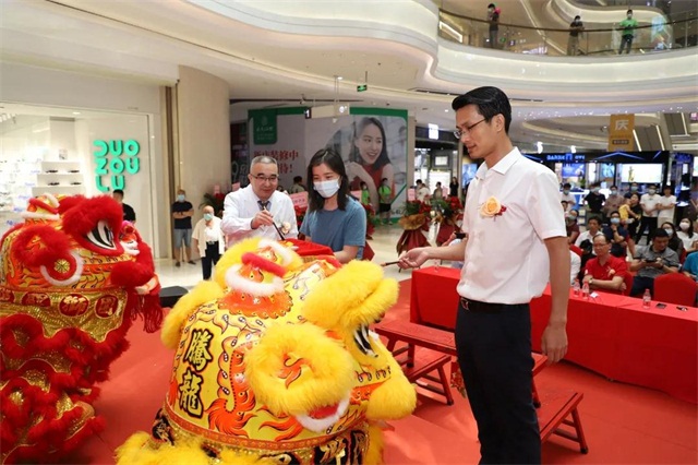 狮子点睛繁华富贵,簪花挂红生意兴隆,金狮开光威武赫赫,祥狮献瑞瑞气临门。由企鹅医生•正夫口腔医疗副总张运发先生、企鹅医生•正夫口腔水贝IBC店院长张荣水先生为雄狮点睛。